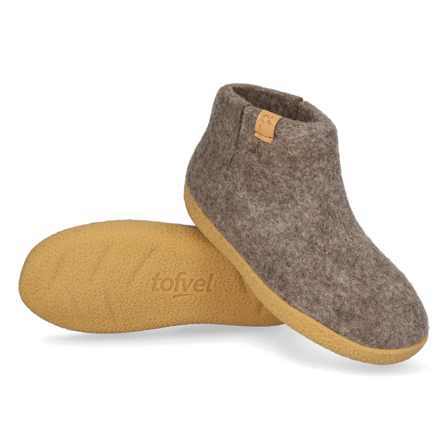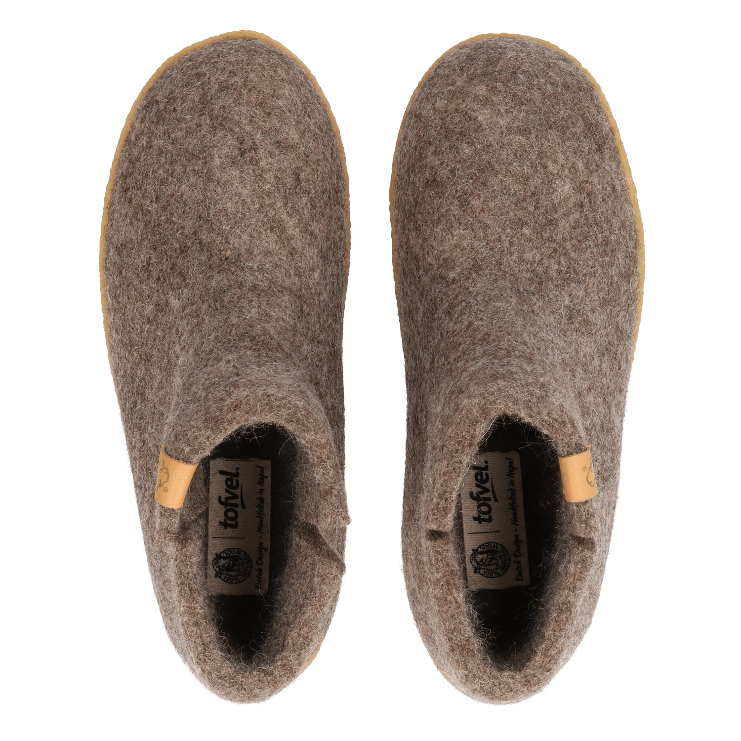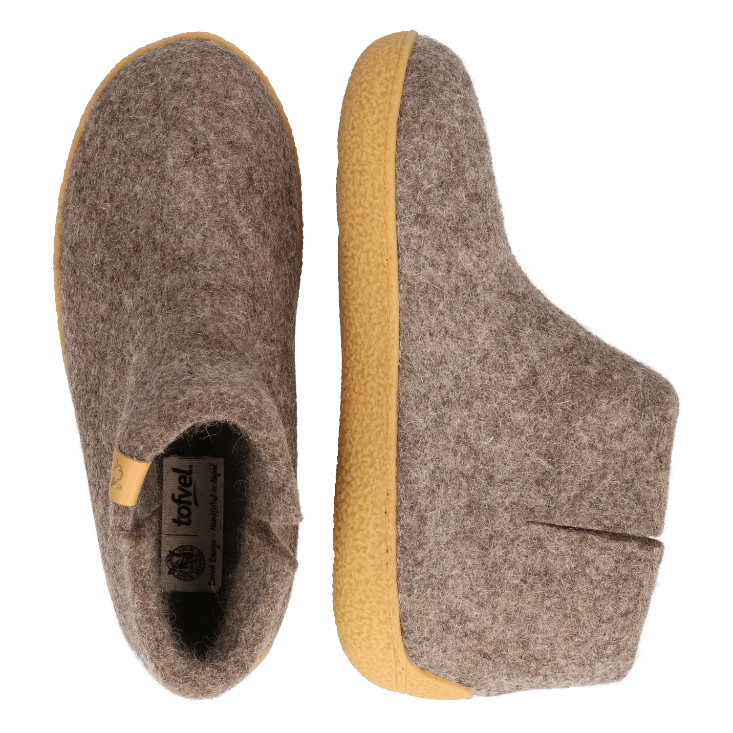 Jeder Tofvel wird in Nepal auf sozial verantwortliche und authentische Weise von Hand gefertigt. Das Obermaterial besteht vollständig aus 100 % natürlichem Wollfilz und verfügt über eine integrierte Sohle für zusätzlichen Komfort. Diese Rabara Maha hat eine honigfarbene Gummilaufsohle. Die strapazierfähige Sohle macht die Hausschuhe auch für den Außenbereich geeignet. Sie sind ideal für den Innen- und Außenbereich – rund ums Haus, auf dem Campingplatz oder in einer Berghütte – wenn du den Komfort von Pantoffeln suchst, um deine Füße warm zu halten. Dank des natürlichen Wollfilzes aus Schafwolle haben die Hausschuhe mehrere besondere Eigenschaften. Sie sind atmungsaktiv, halten deine Füße im Winter angenehm warm, im Sommer kühl und verhindern unangenehme Gerüche.